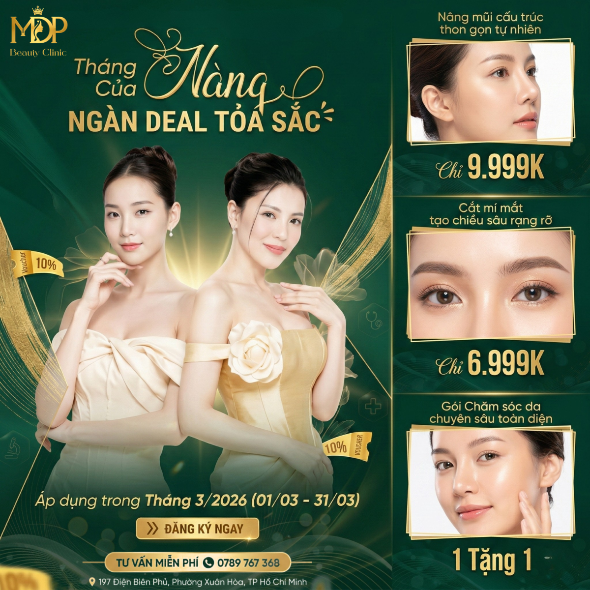 Tháng 3 là thời điểm tuyệt vời nhất để phái đẹp dành sự ưu tiên cho chính mình. Thấu hiểu khát khao sở hữu vẻ đẹp hoàn mỹ, MDP Beauty Clinic chính thức khởi động đại tiệc làm đẹp lớn nhất năm mang tên "Tháng Của Nàng - Ngàn Deal Tỏa Sắc". Cơ hội duy nhất để Quý khách hàng trải nghiệm dịch vụ thẩm mỹ chuẩn Y khoa với mức chi phí tối ưu chưa từng có.
